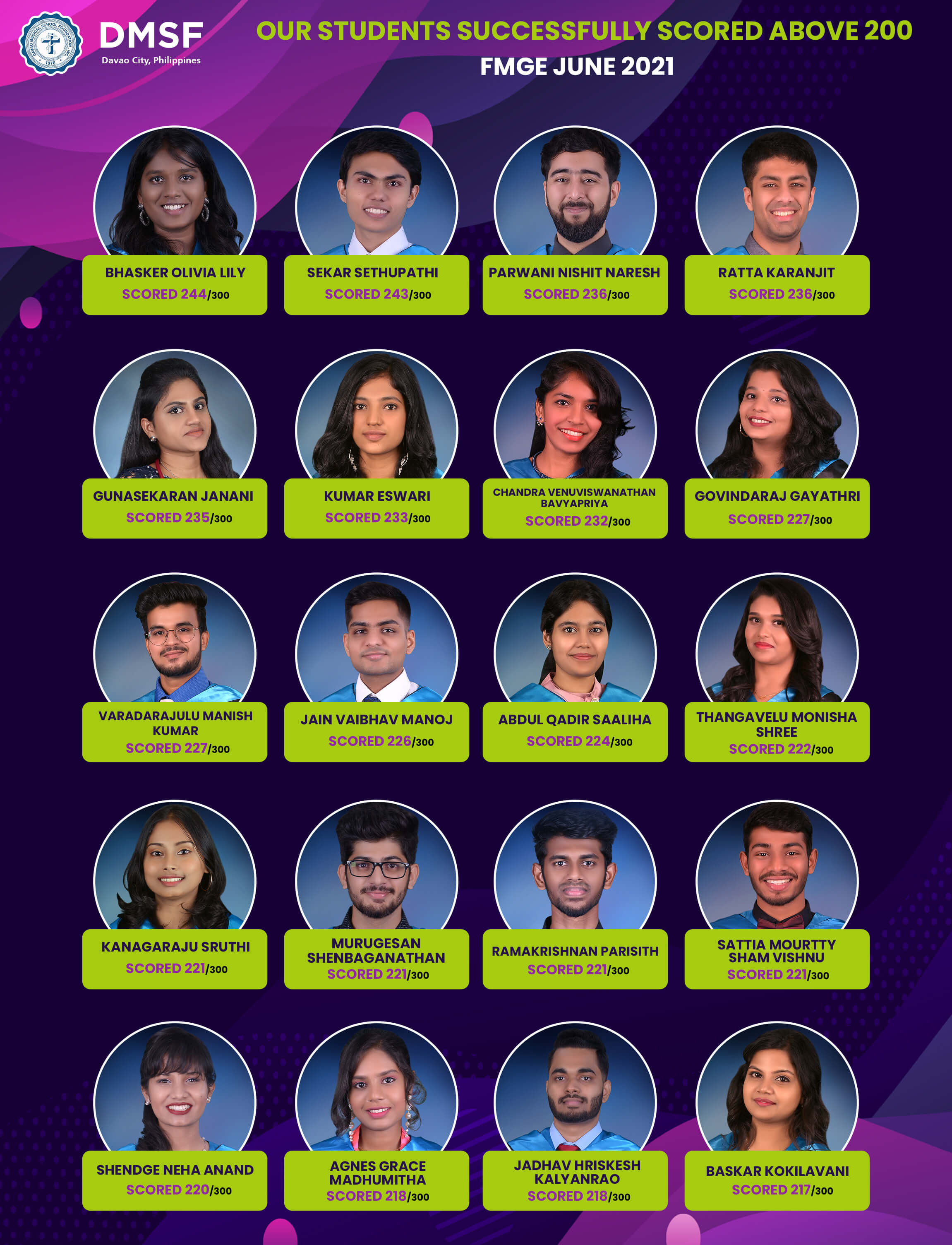 This year at FMGE June 2021, DMSF has registered yet again a whooping 85% passing percentage. 6 out of Top 10 All-India rankings have all been secured by the students of DMSF. Whereas, 60 students have managed to score above 200 which only goes to prove that the students of DMSF have not just cleared the exam but aced it with flying colours.